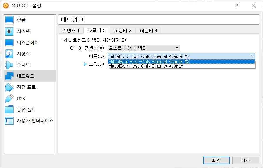 Adapter를 하나 더 만들어 주고 DHCP 서버 사용함에 체크한다