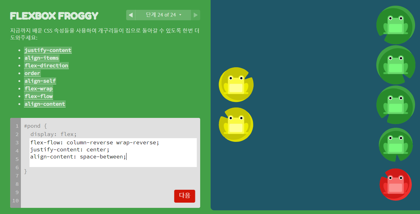 align-content: `center`, `flex-start`, ... 수직축의 컨테이너 사이의 간격 속성