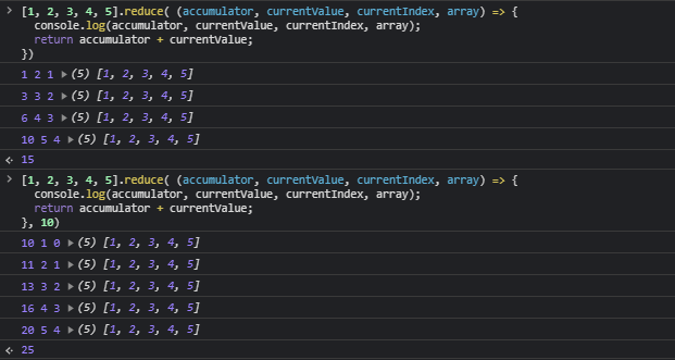 각각의 accumulator, currentValue, currentIndex, array 값은 아래와 같다.