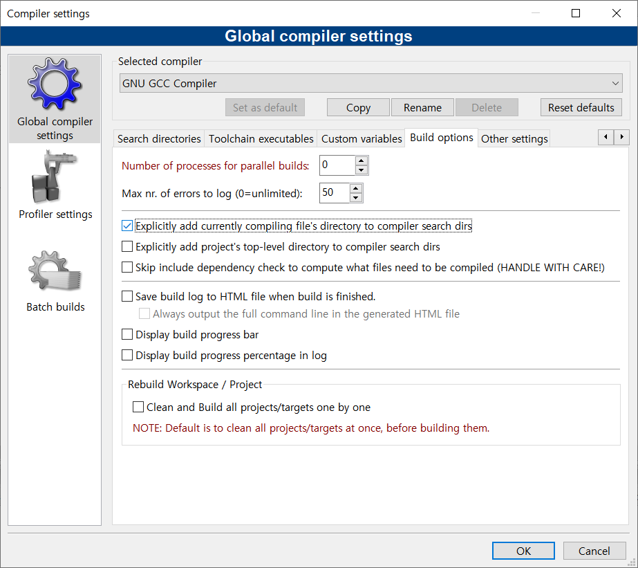 Code Block의 Setting - Compiler 탭에 들어간다