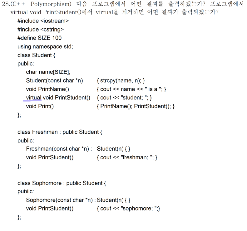 이 때 virtual 을 사용하게 되면 동적할당을 통해 부모(Student)가 아닌 자식(Freshman, Sophomore) 의 함수를 호출하게 되는 것입니다