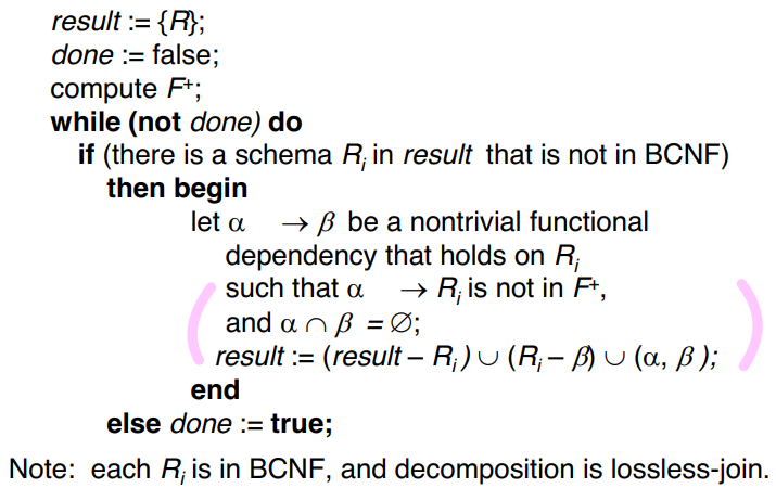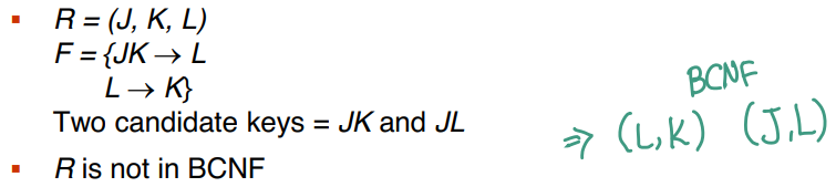 FD(Frequency Dependencies)의 집합 F에 대한 관계 R은 F+ 형식의 모든 FD에 대해 BCNF를 만족한다