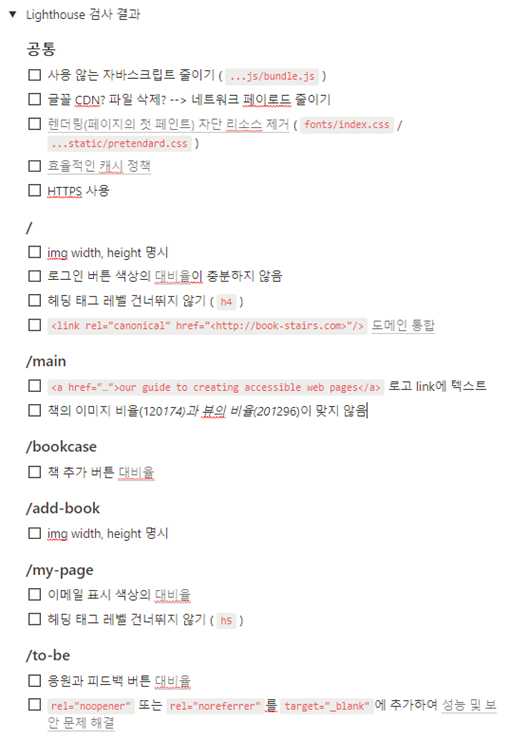 기본적인 서비스 개발 후에 Lighthouse를 통해 웹 표준 검사도 진행하여 수정작업을 진행하였다
