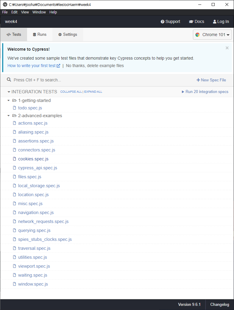 cypress / intefration / 생성폴더 / 생성파일명.spec.js 파일에서 아래와 같이 테스트 코드를 작성하면, 아래 사진과 같이 뜨게 된다