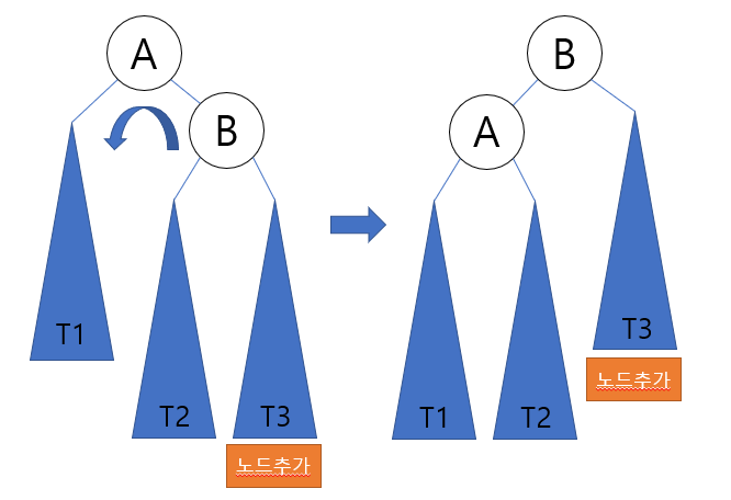 RR 타입은 조상 노드 A의 오른쪽 서브 트리의 오른쪽 서브 트리에 노드가 추가됨으로 해서 발생한다. 일반적인 경우의 RR 타입은 다음 그림처럼 노드 A와 B의 위치를 바꾸어 주고 서브 트리들을 정리하면 균형 트리가 된다.