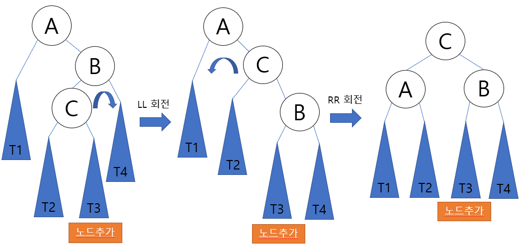 LR 타입은 그림과 같이 A의 왼쪽 자식의 오른쪽 서브 트리에 노드가 추가됨으로 해서 발생한다. LR 회전은 균형 트리를 만들기 위하여 2번의 회전이 필요하다. LR 회전은 RR 회전을 한 다음, LL회전을 하면 된다.